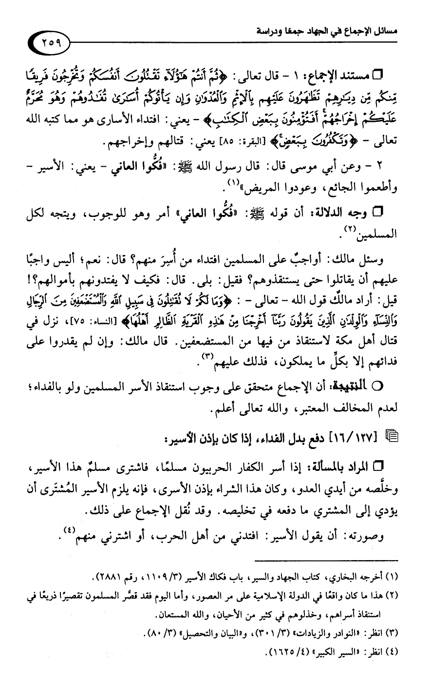 وسئل مالك: أواجبٌ على المسلمين افتداء من أُسِرَ منهم؟ قال: نعم؛ أليس واجبًا عليهم أن يقاتلوا حتى يستنقذوهم؟ فقيل: بلى. قال: فكيف لا يفتدونهم بأموالهم؟ ! قيل: أراد مالكٌ قول اللَّه -تعالى-: {وَمَا لَكُمْ لَا تُقَاتِلُونَ فِي سَبِيلِ اللَّهِ وَالْمُسْتَضْعَفِينَ مِنَ الرِّجَالِ وَالنِّسَاءِ وَالْوِلْدَانِ الَّذِينَ يَقُولُونَ رَبَّنَا أَخْرِجْنَا مِنْ هَذِهِ الْقَرْيَةِ الظَّالِمِ أَهْلُهَا} [النساء: 75]، نزل في قتال أهل مكة لاستنقاذ من فيها من المستضعفين. قال مالك: وإن لم يقدروا على فدائهم إلا بكلِّ ما يملكون، فذلك عليهم (¬3).Rأن الإجماع متحقق على وجوب استنقاذ الأسر المسلمين ولو بالفداء؛ لعدم المخالف المعتبر، واللَّه تعالى أعلم.