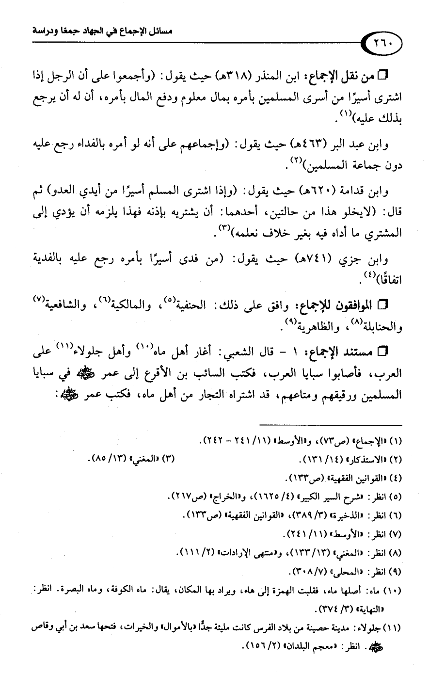 • من نقل الإجماع: ابن المنذر (318 هـ) حيث يقول: (وأجمعوا على أن الرجل إذا اشترى أسيرًا من أسرى المسلمين بأمره بمال معلوم ودفع المال بأمره، أن له أن يرجع بذلك عليه) (¬1).