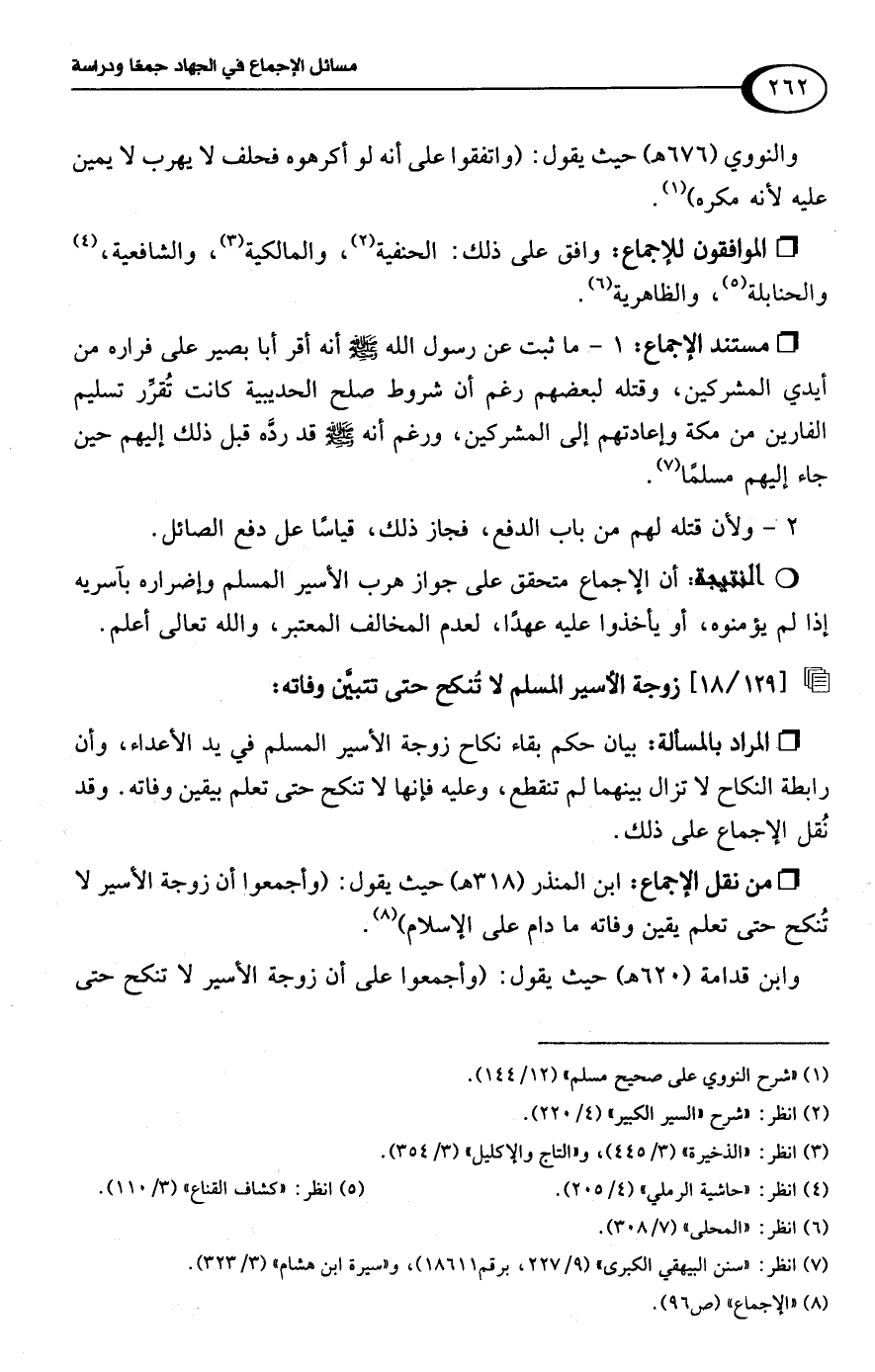 • من نقل الإجماع: ابن المنذر (318 هـ) حيث يقول: (وأجمعوا أن زوجة الأسير لا تُنكح حتى تعلم يقين وفاته ما دام على الإسلام) (¬8).