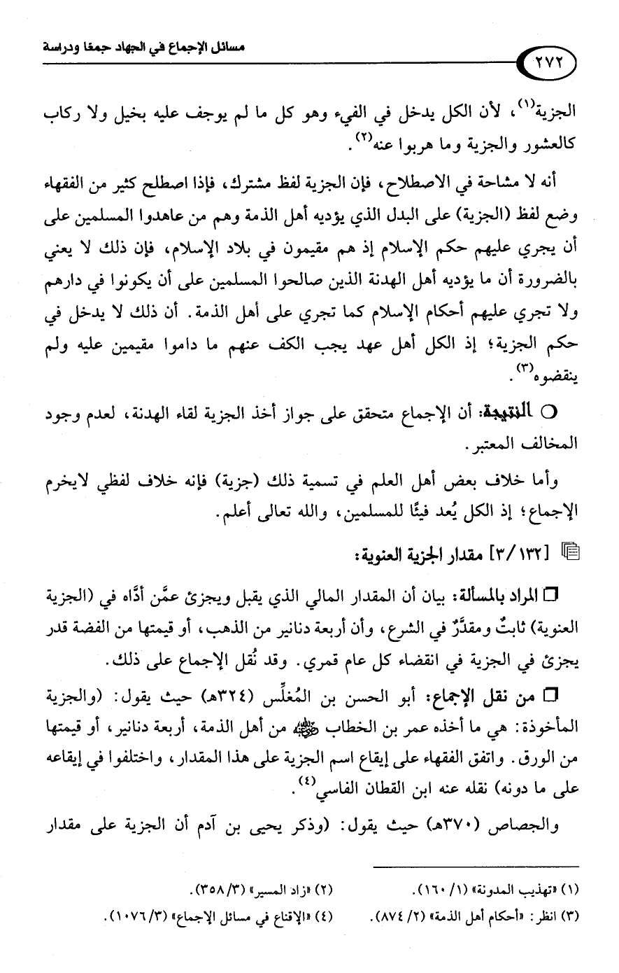أنه لا مشاحة في الاصطلاح، فإن الجزية لفظ مشترك، فإذا اصطلح كثير من الفقهاء وضع لفظ (الجزية) على البدل الذي يؤديه أهل الذمة وهم من عاهدوا المسلمين على أن يجري عليهم حكم الإسلام إذ هم مقيمون في بلاد الإسلام، فإن ذلك لا يعني بالضرورة أن ما يؤديه أهل الهدنة الذين صالحوا المسلمين على أن يكونوا في دارهم ولا تجري عليهم أحكام الإسلام كما تجري على أهل الذمة. أن ذلك لا يدخل في حكم الجزية؛ إذ الكل أهل عهد يجب الكف عنهم ما داموا مقيمين عليه ولم ينقضوه (¬3).Rأن الإجماع متحقق على جواز أخذ الجزية لقاء الهدنة، لعدم وجود المخالف المعتبر.