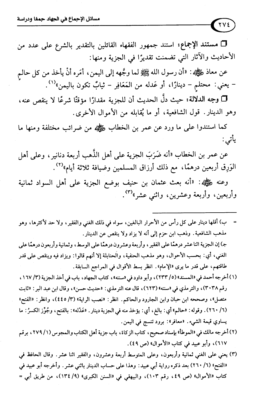 • وجه الدلالة: حيث دلَّ الحديث أن للجزية مقدارًا مؤقتًا شرعًا لا ينقص عنه، وهو الدينار. قول الشافعية، أو ما يُقابله من الأموال الأخرى.