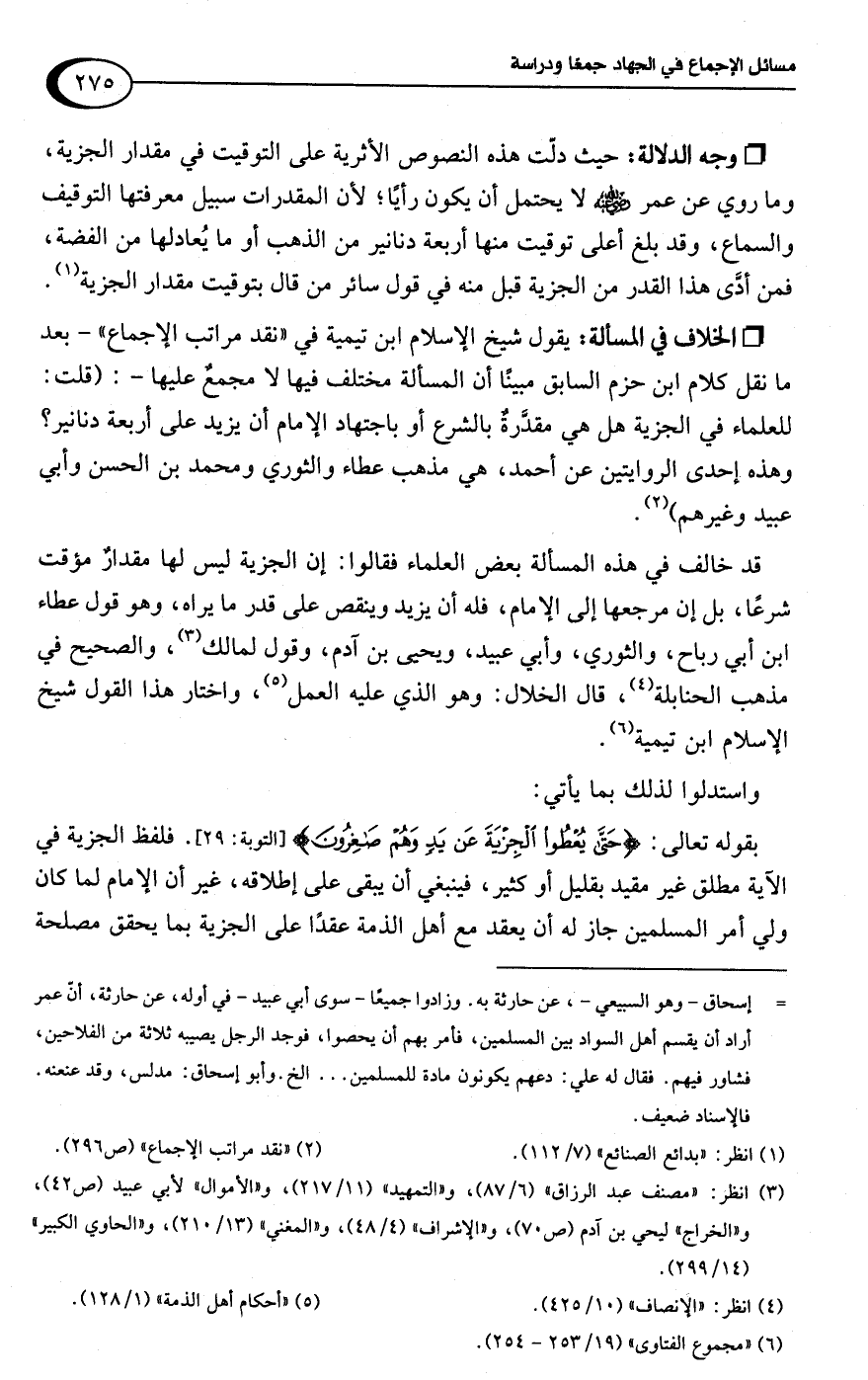 • الخلاف في المسألة: يقول شيخ الإسلام ابن تيمية في "نقد مراتب الإجماع" -بعد ما نقل كلام ابن حزم السابق مبينًا أن المسألة مختلف فيها لا مجمعٌ عليها-: (قلت: للعلماء في الجزية هل هي مقدَّرةٌ بالشرع أو باجتهاد الإمام أن يزيد على أربعة دنانير؟ وهذه إحدى الروايتين عن أحمد، هي مذهب عطاء والثوري ومحمد بن الحسن وأبي عبيد وغيرهم) (¬2).