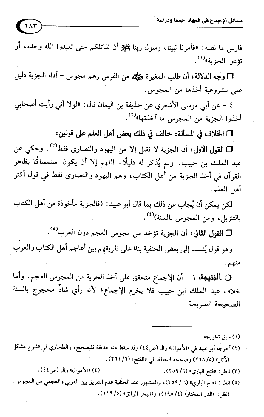 وهو قول يُنسب إلى بعض الحنفية بناءً على تفريقهم بين أعاجم أهل الكتاب والعرب منهم. R 1 - أن الإجماع متحقق على أخذ الجزية من المجوس العجم، وأما خلاف عبد الملك ابن حبيب فلا يخرم الإجماع؛ لأنه رأي شاذ محجوج بالسنة الصحيحة الصريحة.