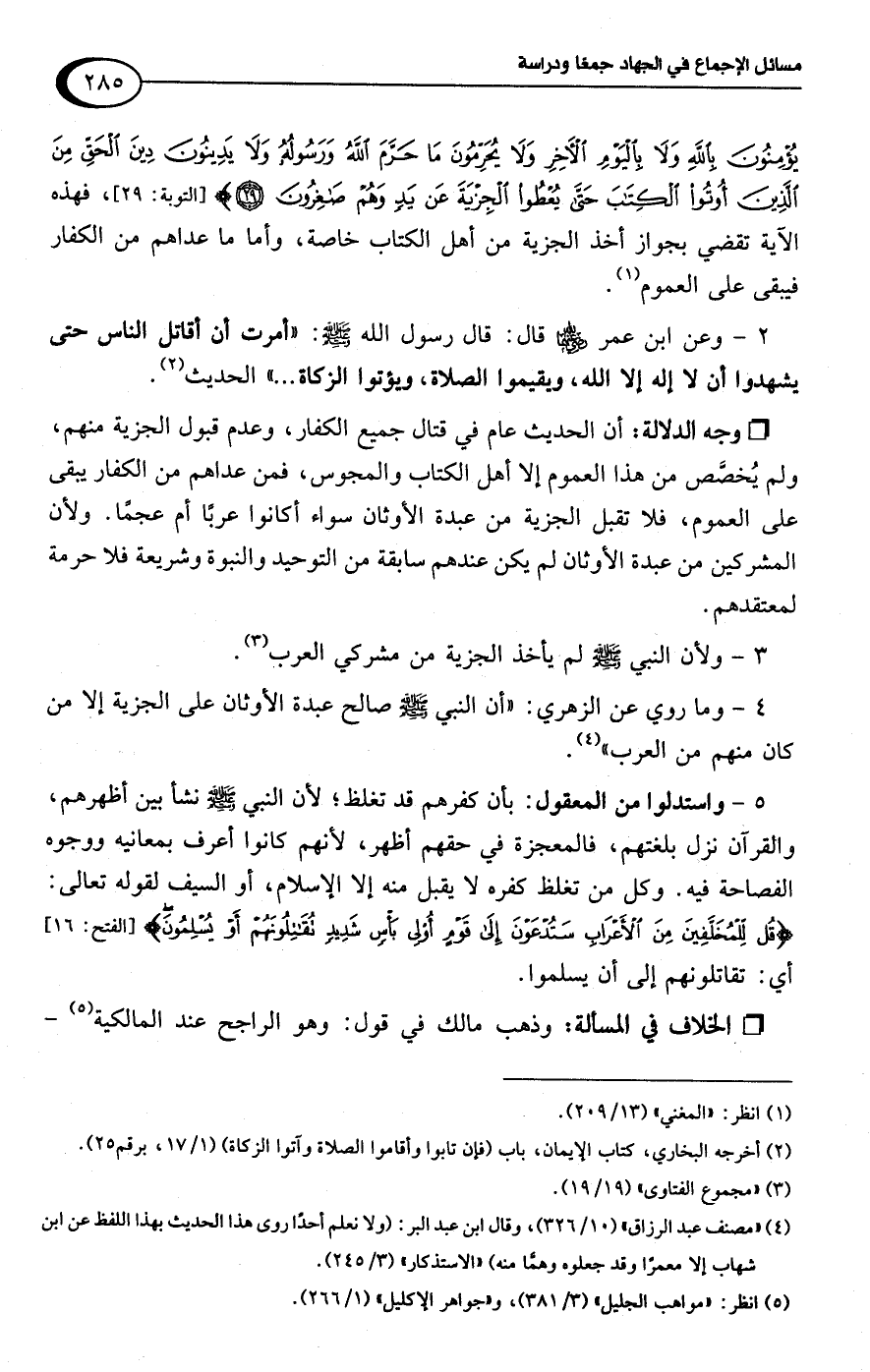 4 - وما روي عن الزهري: "أن النبي -صلى اللَّه عليه وسلم- صالح عبدة الأوثان على الجزية إلا من كان منهم من العرب" (¬4).