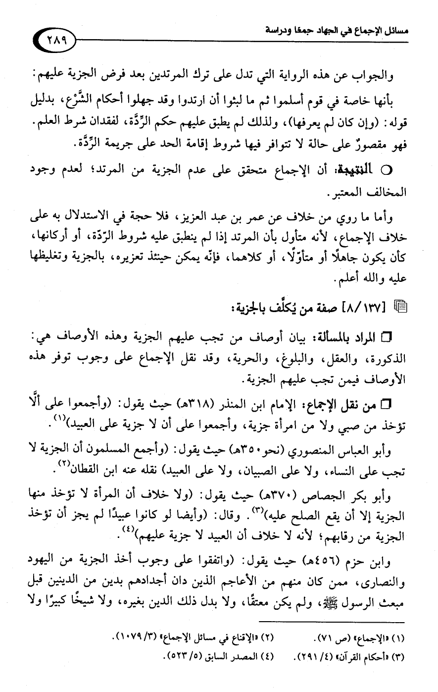 وابن حزم (456 هـ) حيث يقول: (واتفقوا على وجوب أخذ الجزية من اليهود والنصارى، ممن كان منهم من الأعاجم الذين دان أجدادهم بدين من الدينين قبل مبعث الرسول -صلى اللَّه عليه وسلم-، ولم يكن معتقًا، ولا بدل ذلك الدين بغيره، ولا شيخًا كبيرًا ولا