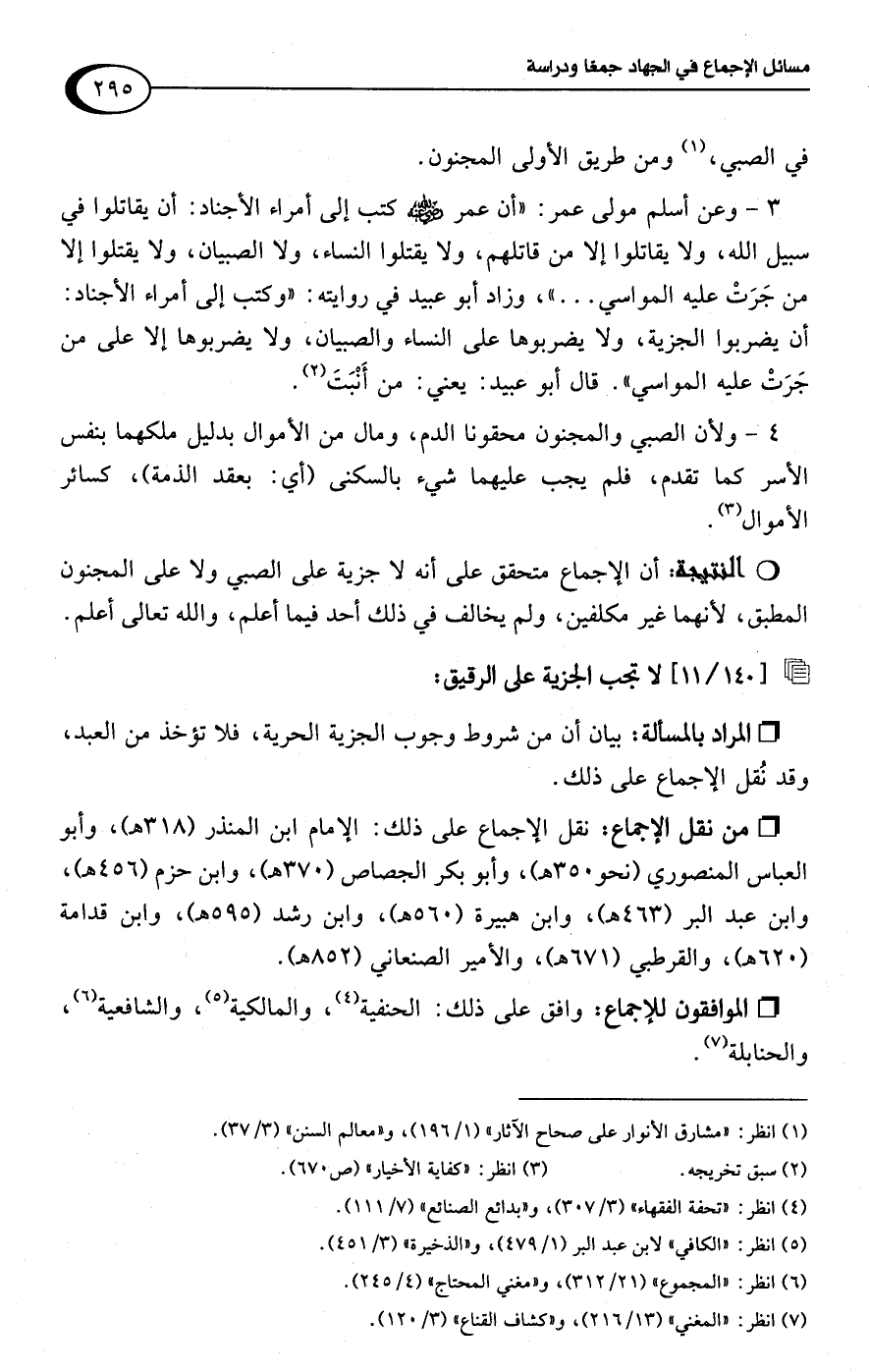 4 - ولأن الصبي والمجنون محقونا الدم، ومال من الأموال بدليل ملكهما بنفس الأسر كما تقدم، فلم يجب عليهما شيء بالسكنى (أي: بعقد الذمة)، كسائر الأموال (¬3).Rأن الإجماع متحقق على أنه لا جزية على الصبي ولا على المجنون المطبق، لأنهما غير مكلفين، ولم يخالف في ذلك أحد فيما أعلم، واللَّه تعالى أعلم.