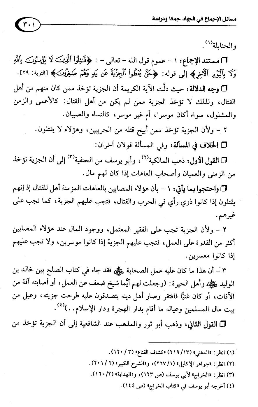3 - أن هذا ما كان عليه عمل الصحابة -رضي اللَّه عنهم- فقد جاء في كتاب الصلح بين خالد بن الوليد -رضي اللَّه عنه- وأهل الحيرة: (وجعلت لهم أيُّما شيخ ضعف عن العمل، أو أصابته آفة من الآفات، أو كان غنيًّا فافتقر وصار أهل دينه يتصدقون عليه طرحت جزيته، وعيل من بيت مال المسلمين وعياله ما أقام بدار الهجرة ودار الإسلام. .) (¬4).