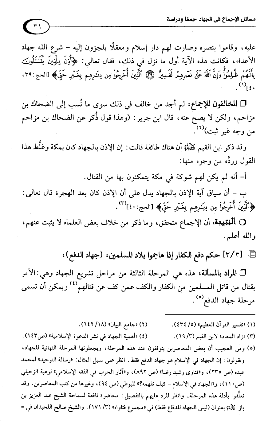 (¬5) ومن العجيب أن بعض المعاصرين يتوقفون عند هذه المرحلة، ويجعلونها المرحلة النهائية للجهاد، ويقولون: إن الجهاد في الإسلام هو جهاد الدفع فقط. انظر على سبيل المثال: "رسالة التوحيد" لمحمد عبده (ص 235)، و"فتاوى رشيد رضا" (ص 892)، و"آثار الحرب في الفقه الإسلامي" لوهبة الزحيلي (ص 110)، و"الجهاد في الإسلام -كيف نفهمه؟ " للبوطي (ص 94)، وغيرها من كتب المعاصرين. وقد تعلَّقوا بأدلة هذه المرحلة. وانظر للرد عليهم بالتفصيل: محاضرة نافعة لسماحة الشيخ عبد العزيز بن باز رحمه اللَّه بعنوان (ليس الجهاد للدفاع فقط) في "مجموع فتاواه" (3/ 171). والشيخ صالح اللحيدان في =
