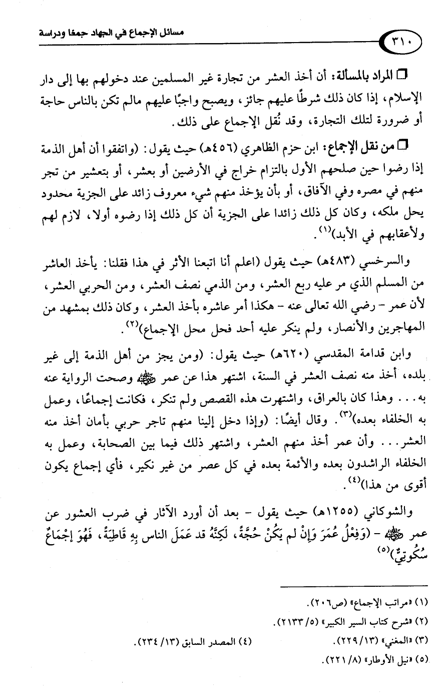 والسرخسي (483 هـ) حيث يقول (اعلم أنا اتبعنا الأثر في هذا فقلنا: يأخذ العاشر من المسلم الذي مر عليه ربع العشر، ومن الذمي نصف العشر، ومن الحربي العشر، لأن عمر -رضي اللَّه تعالى عنه- هكذا أمر عاشره بأخذ العشر، وكان ذلك بمشهد من المهاجرين والأنصار، ولم ينكر عليه أحد فحل محل الإجماع) (¬2).