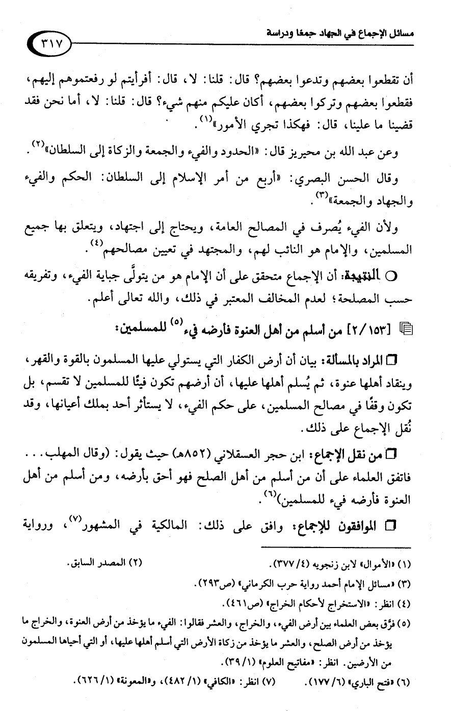 • من نقل الإجماع: ابن حجر العسقلاني (852 هـ) حيث يقول: (وقال المهلب. . . فاتفق العلماء على أن من أسلم من أهل الصلح فهو أحق بأرضه، ومن أسلم من أهل العنوة فأرضه فيء للمسلمين) (¬6).