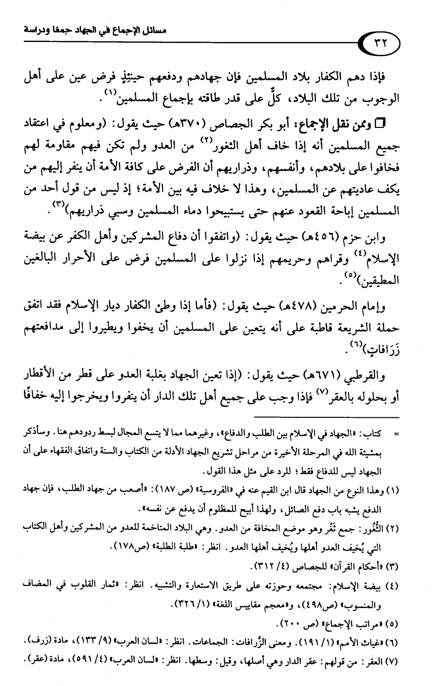 وابن حزم (456 هـ) حيث يقول: (واتفقوا أن دفاع المشركين وأهل الكفر عن بيضة الإسلام (¬4) وقراهم وحريمهم إذا نزلوا على المسلمين فرض على الأحرار البالغين المطيقين) (¬5).