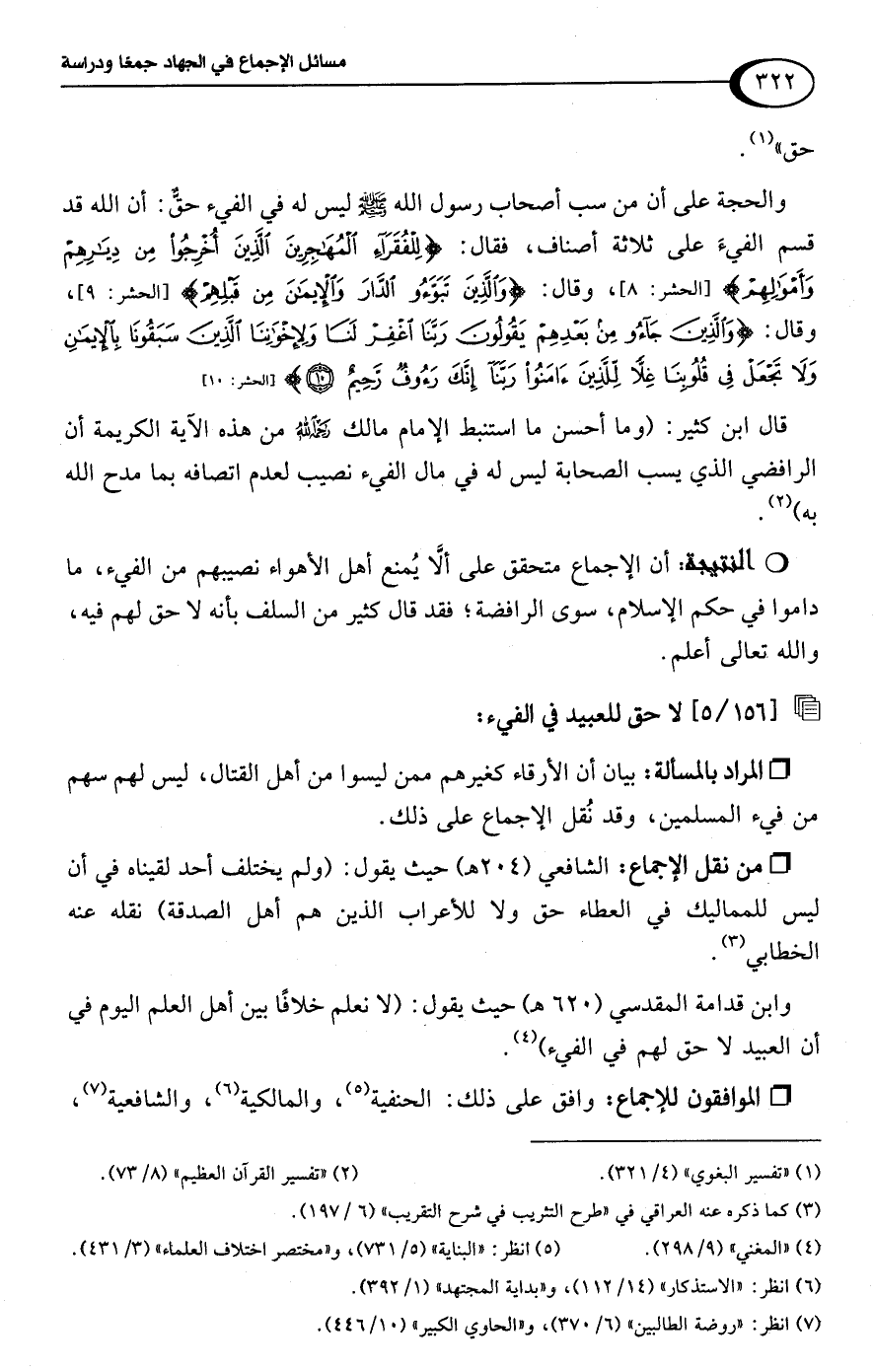 وابن قدامة المقدسي (620 هـ) حيث يقول: (لا نعلم خلافًا بين أهل العلم اليوم في أن العبيد لا حق لهم في الفيء) (¬4).