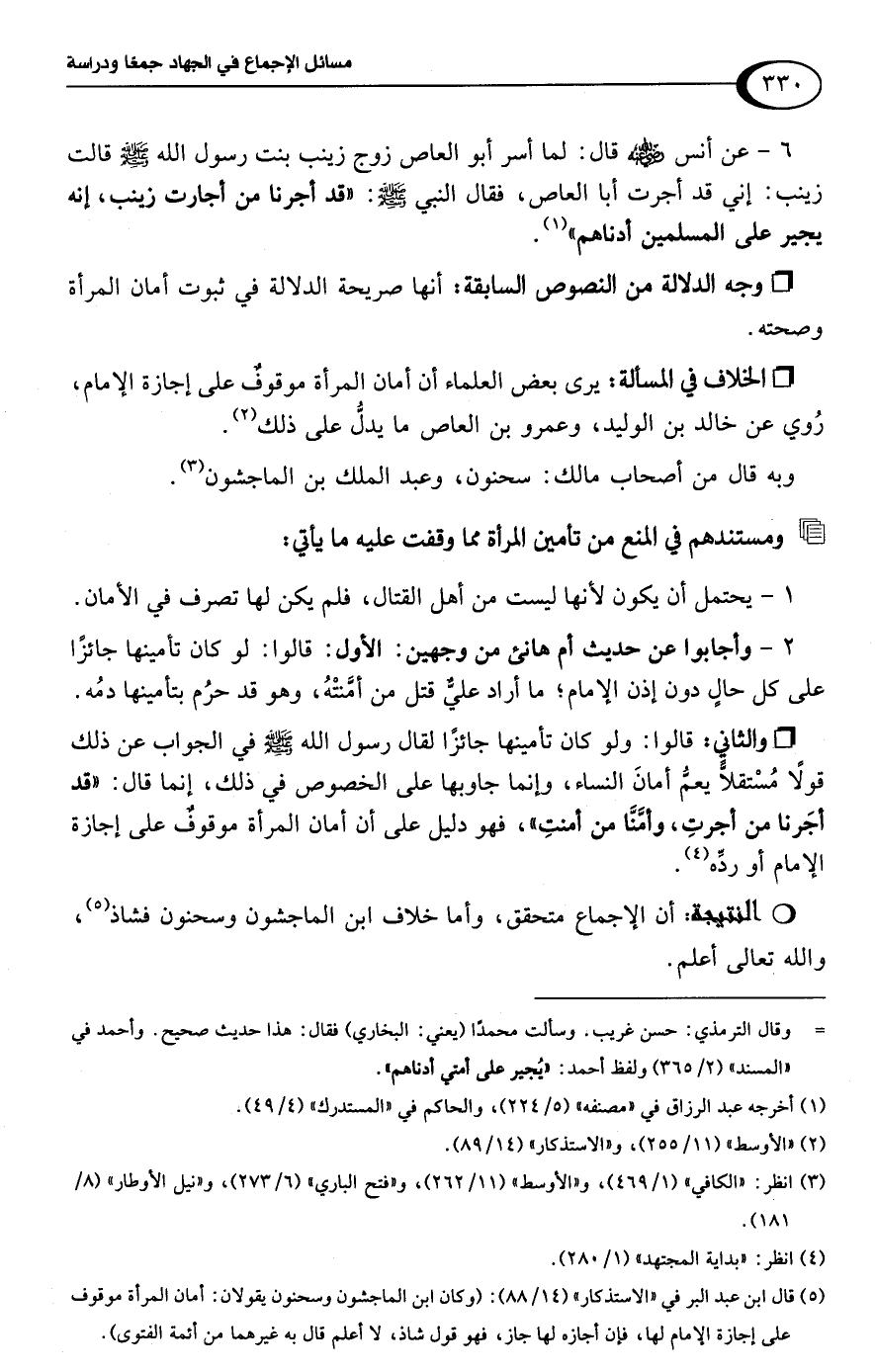 (¬5) قال ابن عبد البر في "الاستذكار" (14/ 88): (وكان ابن الماجشون وسحنون يقولان: أمان المرأة موقوف على إجازة الإمام لها، فإن أجازه لها جاز، فهو قول شاذ، لا أعلم قال به غيرهما من أئمة الفتوى).