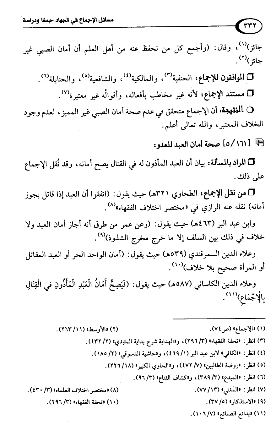وعلاء الدين الكاساني (587 هـ) حيث يقول: (فَيَصِحُّ أَمَانُ الْعَبْدِ الْمَأْذُونِ في الْقِتَالِ بِالْإِجْمَاعِ) (¬11).