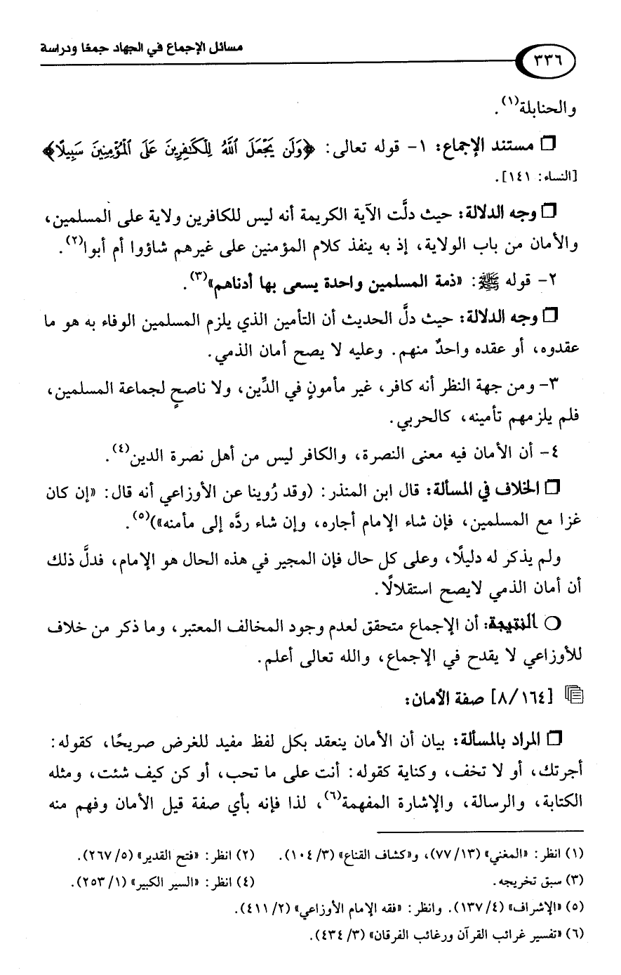 ولم يذكر له دليلًا، وعلى كل حال فإن المجير في هذه الحال هو الإمام، فدلَّ ذلك أن أمان الذمي لا يصح استقلالًا.Rأن الإجماع متحقق لعدم وجود المخالف المعتبر، وما ذكر من خلاف للأوزاعي لا يقدح في الإجماع، واللَّه تعالى أعلم.