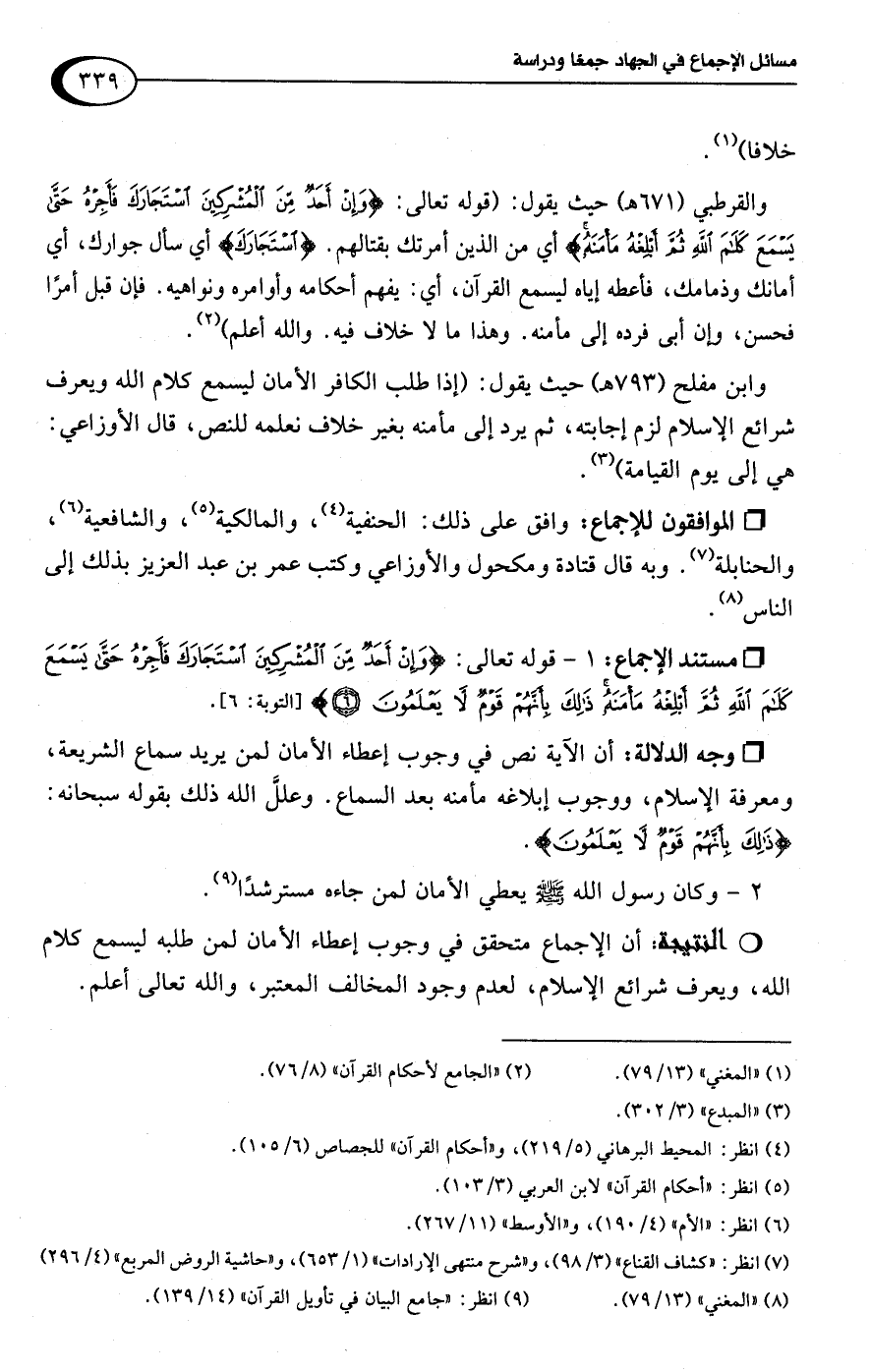 والقرطبي (671 هـ) حيث يقول: (قوله تعالى: {وَإِنْ أَحَدٌ مِنَ الْمُشْرِكِينَ اسْتَجَارَكَ فَأَجِرْهُ حَتَّى يَسْمَعَ كَلَامَ اللَّهِ ثُمَّ أَبْلِغْهُ مَأْمَنَهُ} أي من الذين أمرتك بقتالهم. {اسْتَجَارَكَ} أي سأل جوارك، أي أمانك وذمامك، فأعطه إياه ليسمع القرآن، أي: يفهم أحكامه وأوامره ونواهيه. فإن قبل أمرًا فحسن، وإن أبى فرده إلى مأمنه. وهذا ما لا خلاف فيه. واللَّه اعلم) (¬2).
