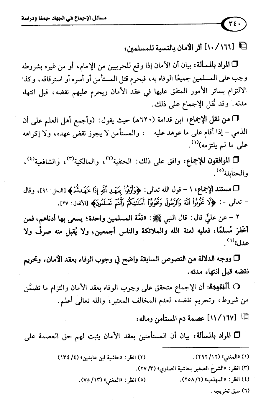 • ووجه الدلالة من النصوص السابقة واضح في وجوب الوفاء بعقد الأمان، وتحريم نقضه قبل انتهاء مدته.Rأن الإجماع متحقق على وجوب الوفاء بعقد الأمان والتزام ما تضمَّن من شروط، وتحريم نقضه، لعدم المخالف المعتبر، واللَّه تعالى أعلم.