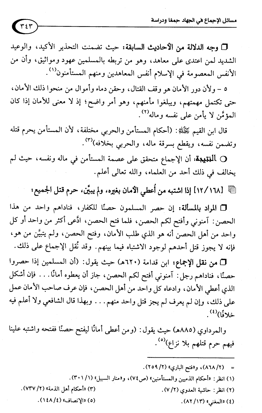 والمرداوي (885 هـ) حيث يقول: (ومن أعطى أمانًا ليفتح حصنًا ففتحه واشتبه علينا فيهم حرم قتلهم بلا نزاع) (¬5).