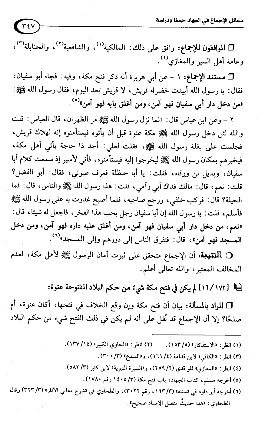 • الموافقون للإجماع: وافق على ذلك: المالكية (¬1)، والشافعية (¬2)، والحنابلة (¬3)، وعامة أهل السير والمغازي (¬4).
