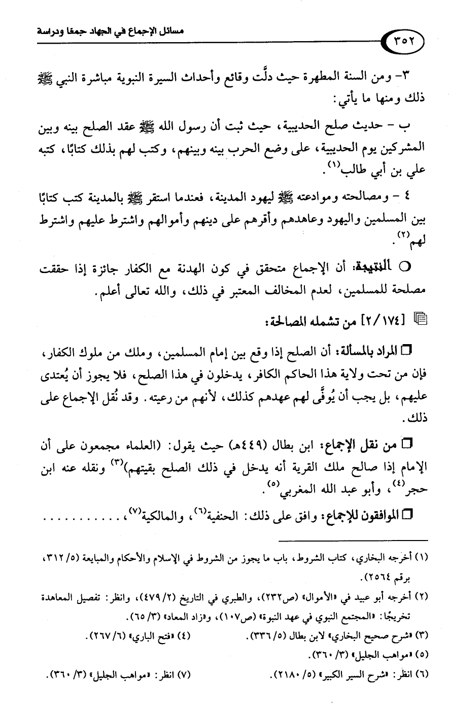 • من نقل الإجماع: ابن بطال (449 هـ) حيث يقول: (العلماء مجمعون على أن الإمام إذا صالح ملك القرية أنه يدخل في ذلك الصلح بقيتهم) (¬3) ونقله عنه ابن حجر (¬4)، وأبو عبد اللَّه المغربي (¬5).