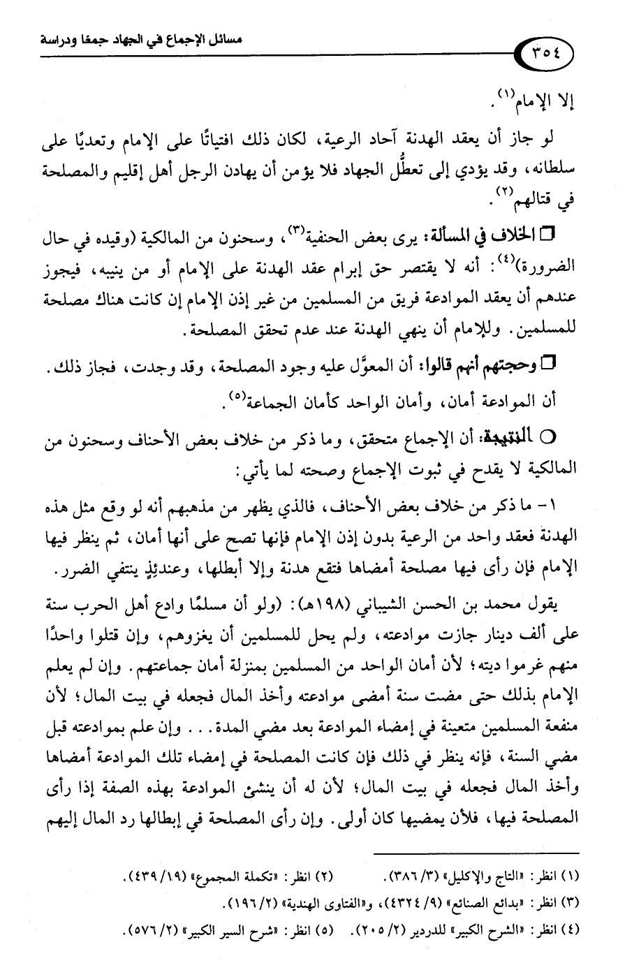 • وحجتهم أنهم قالوا: أن المعوَّل عليه وجود المصلحة، وقد وجدت، فجاز ذلك. أن الموادعة أمان، وأمان الواحد كأمان الجماعة (¬5).Rأن الإجماع متحقق، وما ذكر من خلاف بعض الأحناف وسحنون من المالكية لا يقدح في ثبوت الإجماع وصحته لما يأتي: