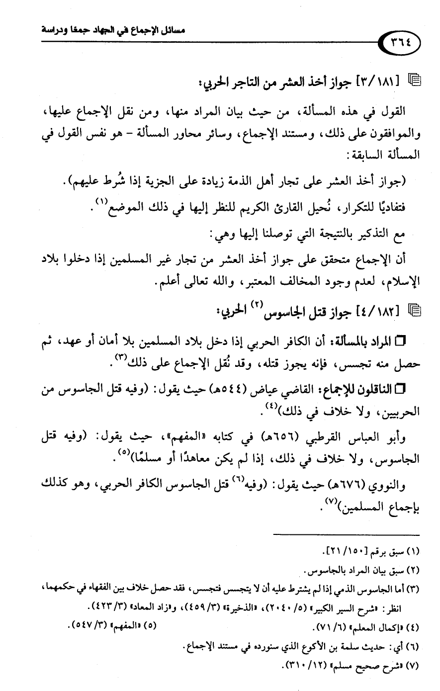 • الناقلون للإجماع: القاضي عياض (544 هـ) حيث يقول: (وفيه قتل الجاسوس من الحربيين، ولا خلاف في ذلك) (¬4).