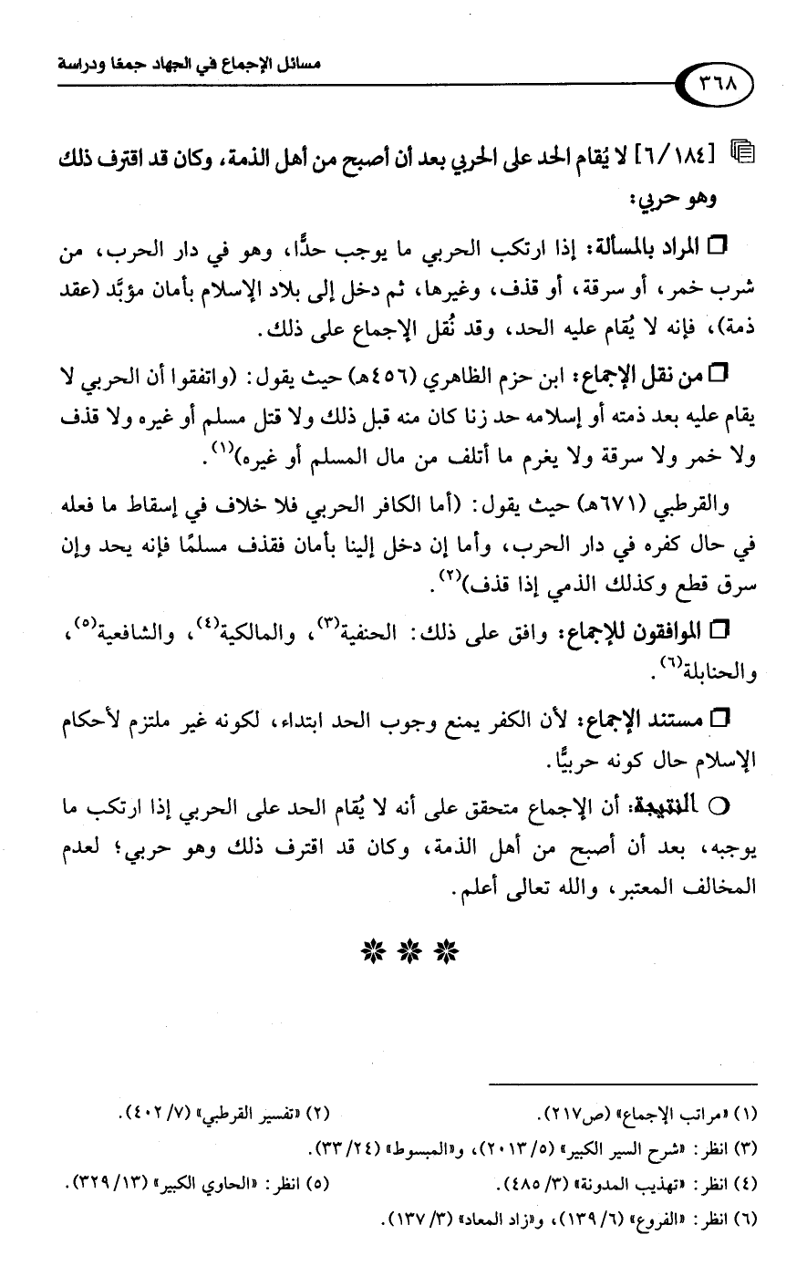[184/ 6] لا يُقام الحد على الحربي بعد أن أصبح من أهل الذمة، وكان قد اقترف ذلك وهو حربي:
