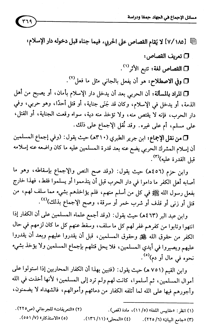 [185/ 7] لا يُقام القصاص على الحربي، فيما جناه قبل دخوله دار الإسلام: