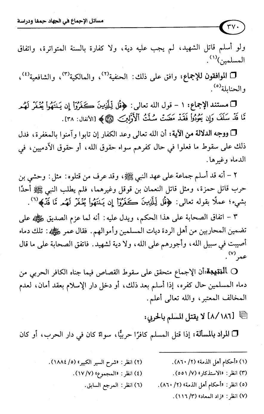 3 - اتفاق الصحابة على هذا الحكم، ويدل عليه: أنه لما عزم الصديق -رضي اللَّه عنه- على تضمين المحاربين من أهل الردة ديات المسلمين وأموالهم. فقال عمر -رضي اللَّه عنه-: تلك دماء أصيبت في سبيل اللَّه، وأجورهم على اللَّه، ولا دية لشهيد. فاتفق الصحابة على ما قال عمر (¬7).Rأن الإجماع متحقق على سقوط القصاص فيما جناه الكافر الحربي من دماء المسلمين حال كفره، إذا أسلم بعد ذلك، أو دخل دار الإسلام بعقد أمان، لعدم المخالف المعتبر، واللَّه تعالى أعلم.