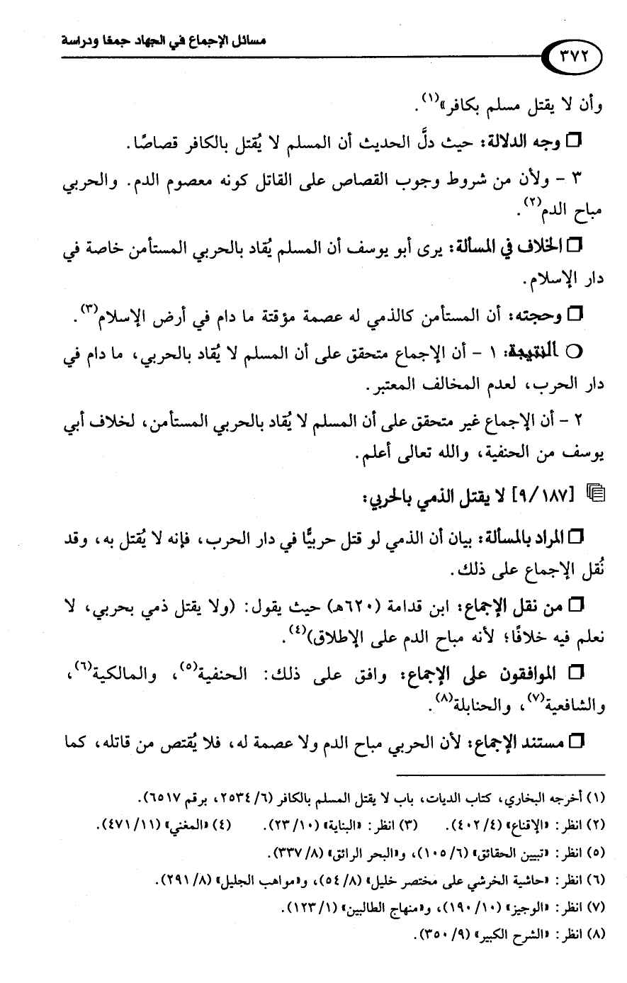 • وحجته: أن المستأمن كالذمي له عصمة مؤقتة ما دام في أرض الإسلام (¬3). R 1 - أن الإجماع متحقق على أن المسلم لا يُقاد بالحربي، ما دام في دار الحرب، لعدم المخالف المعتبر.