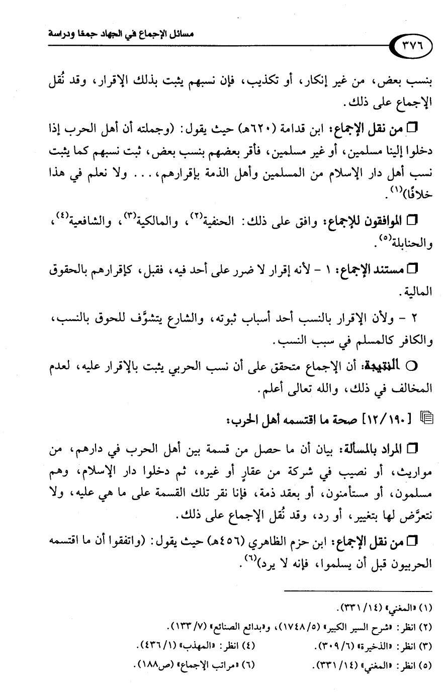 • من نقل الإجماع: ابن قدامة (620 هـ) حيث يقول: (وجملته أن أهل الحرب إذا دخلوا إلينا مسلمين، أو غير مسلمين، فأقر بعضهم بنسب بعض، ثبت نسبهم كما يثبت نسب أهل دار الإسلام من المسلمين وأهل الذمة بإقرارهم، . . . ولا نعلم في هذا خلافًا) (¬1).