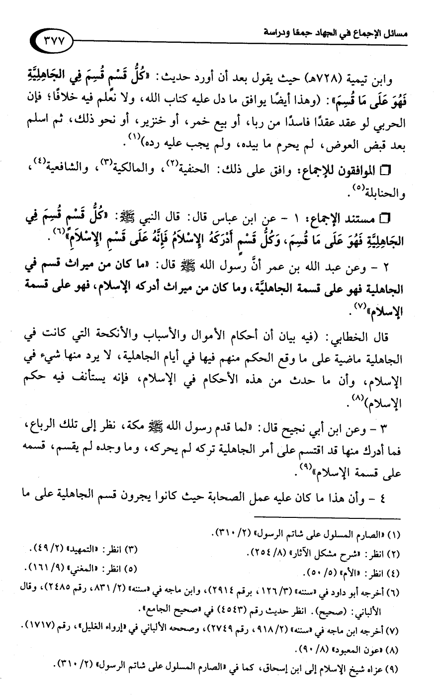 وابن تيمية (728 هـ) حيث يقول بعد أن أورد حديث: "كُلُّ قَسْمٍ قُسِمَ: فِي الجَاهِلِيَّةِ فَهُوَ عَلَى مَا قُسِمَ": (وهذا أيضًا يوافق ما دل عليه كتاب اللَّه، ولا نعلم فيه خلافًا؛ فإن الحربي لو عقد عقدًا فاسدًا من ربا، أو بيع خمر، أو خنزير، أو نحو ذلك، ثم اسلم بعد قبض العوض، لم يحرم ما بيده، ولم يجب عليه رده) (¬1).