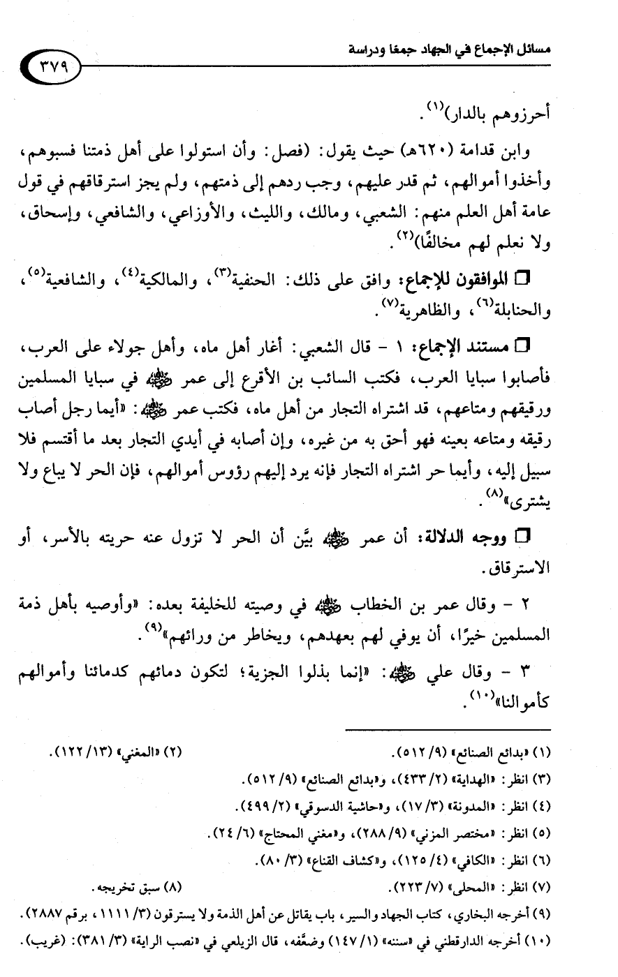 وابن قدامة (620 هـ) حيث يقول: (فصل: وأن استولوا على أهل ذمتنا فسبوهم، وأخذوا أموالهم، ثم قدر عليهم، وجب ردهم إلى ذمتهم، ولم يجز استرقاقهم في قول عامة أهل العلم منهم: الشعبي، ومالك، والليث، والأوزاعي، والشافعي، وإسحاق، ولا نعلم لهم مخالفًا) (¬2).