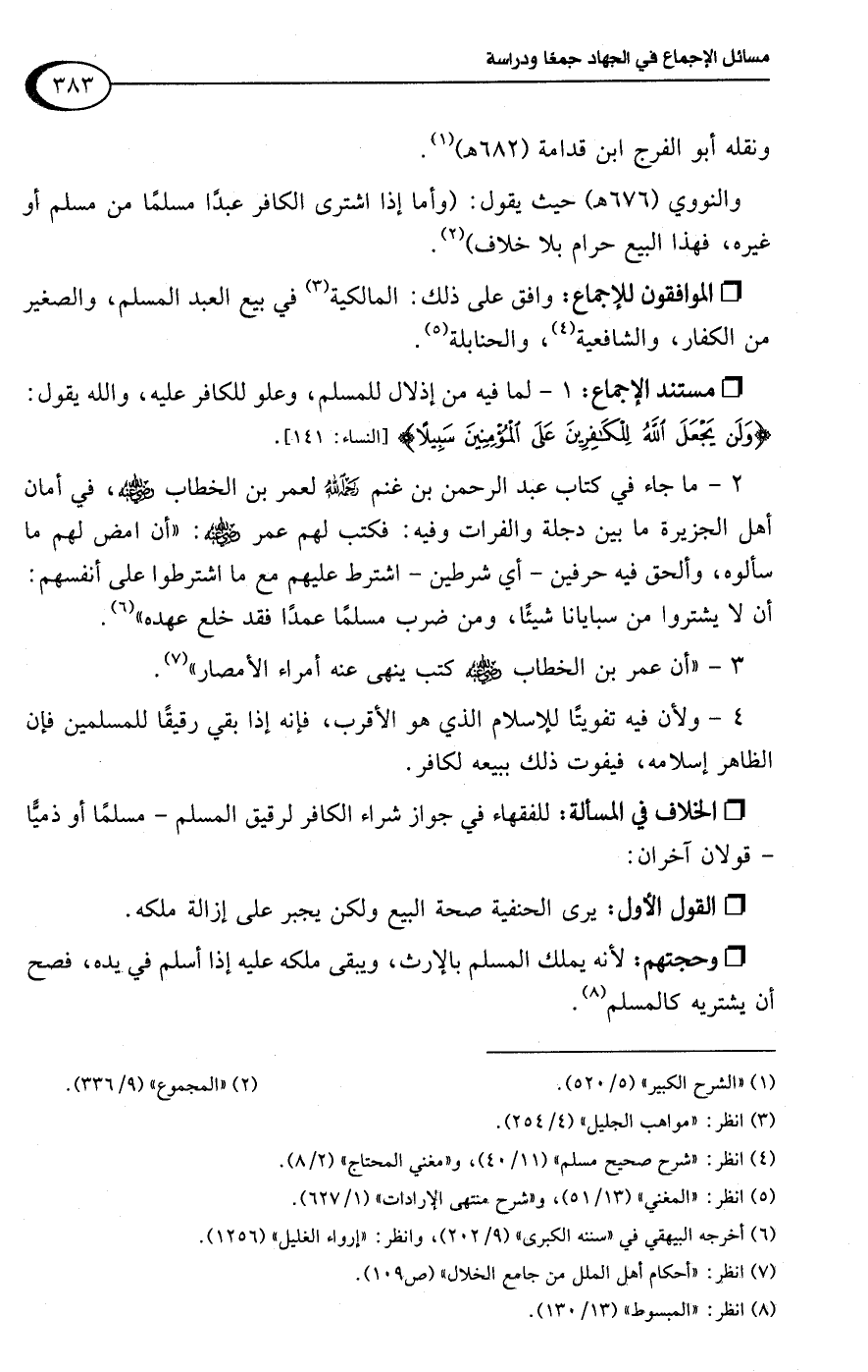 والنووي (676 هـ) حيث يقول: (وأما إذا اشترى الكافر عبدًا مسلمًا من مسلم أو غيره، فهذا البيع حرام بلا خلاف) (¬2).