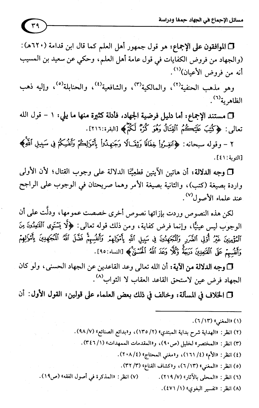 • الموافقون على الإجماع: هو قول جمهور أهل العلم كما قال ابن قدامة (620): (والجهاد من فروض الكفايات في قول عامة أهل العلم، وحكي عن سعيد بن المسيب أنه من فروض الأعيان) (¬1).