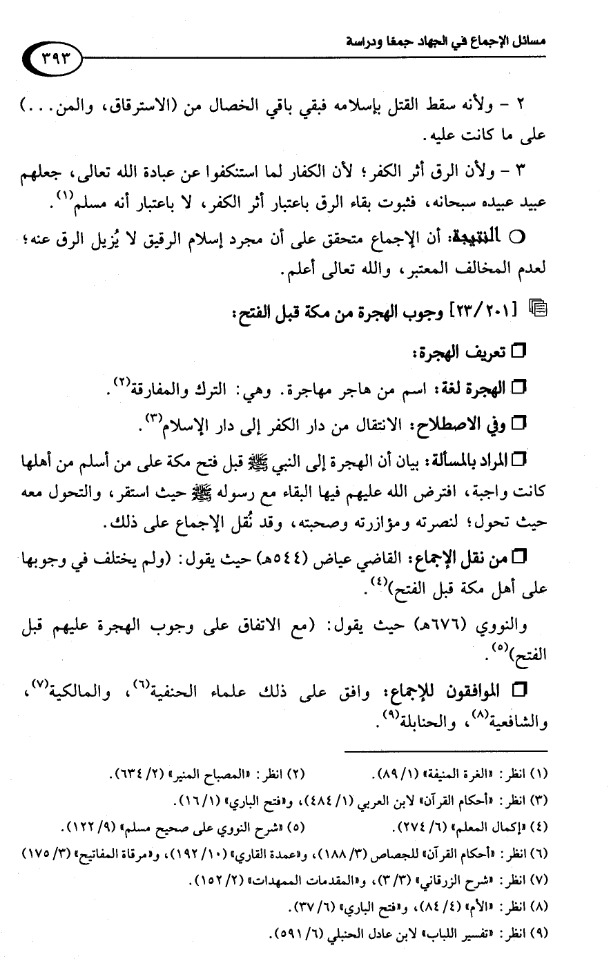 والنووي (676 هـ) حيث يقول: (مع الاتفاق على وجوب الهجرة عليهم قبل الفتح) (¬5).