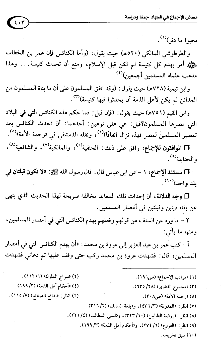 وابن تيمية (728 هـ) حيث يقول: (وقد اتفق المسلمون على أن ما بناه المسلمون من المدائن لم يكن لأهل الذمة أن يحدثوا فيها كنيسة) (¬3).