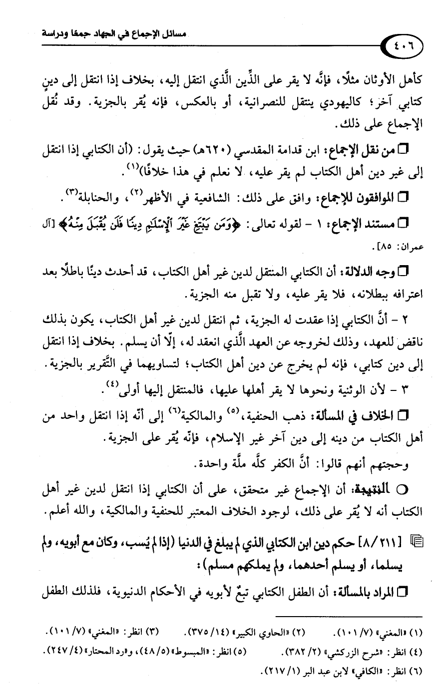 • من نقل الإجماع: ابن قدامة المقدسي (620 هـ) حيث يقول: (أن الكتابي إذا انتقل إلى غير دين أهل الكتاب لم يقر عليه، لا نعلم في هذا خلافًا) (¬1).