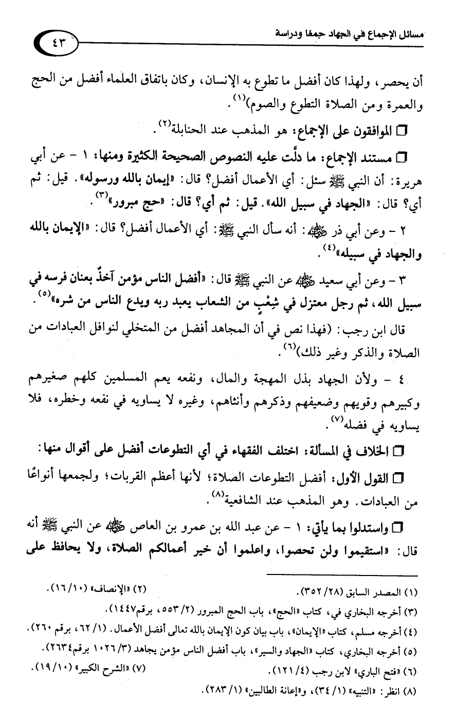 أن يحصر، ولهذا كان أفضل ما تطوع به الإنسان، وكان باتفاق العلماء أفضل من الحج والعمرة ومن الصلاة التطوع والصوم) (¬1).