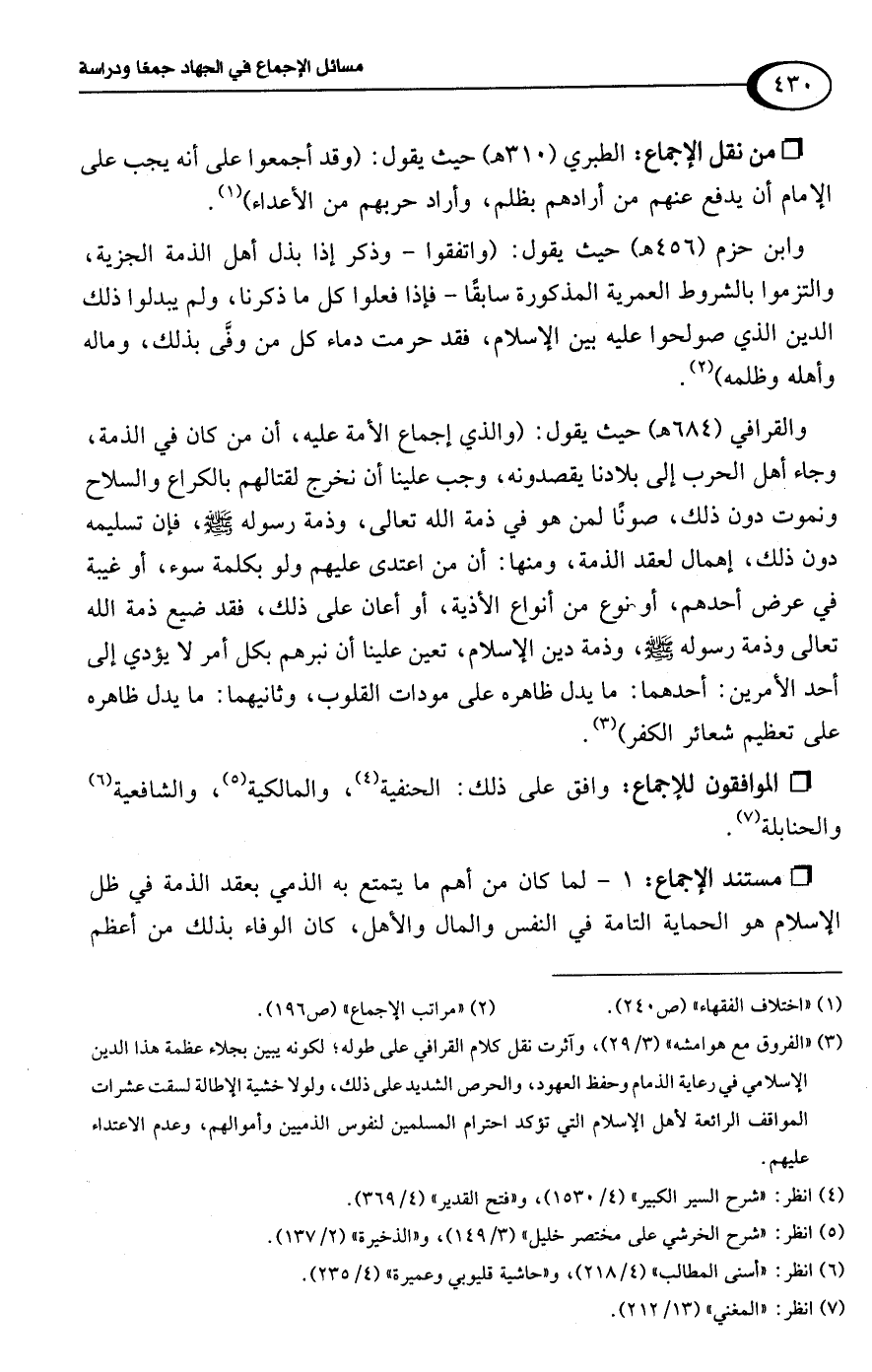 والقرافي (684 هـ) حيث يقول: (والذي إجماع الأمة عليه، أن من كان في الذمة، وجاء أهل الحرب إلى بلادنا يقصدونه، وجب علينا أن نخرج لقتالهم بالكراع والسلاح ونموت دون ذلك، صونًا لمن هو في ذمة اللَّه تعالى، وذمة رسوله -صلى اللَّه عليه وسلم-، فإن تسليمه دون ذلك، إهمال لعقد الذمة، ومنها: أن من اعتدى عليهم ولو بكلمة سوء، أو غيبة في عرض أحدهم، أو نوع من أنواع الأذية، أو أعان على ذلك، فقد ضيع ذمة اللَّه تعالى وذمة رسوله -صلى اللَّه عليه وسلم-، وذمة دين الإسلام، تعين علينا أن نبرهم بكل أمر لا يؤدي إلى أحد الأمرين: أحدهما: ما يدل ظاهره على مودات القلوب، وثانيهما: ما يدل ظاهره على تعظيم شعائر الكفر) (¬3).