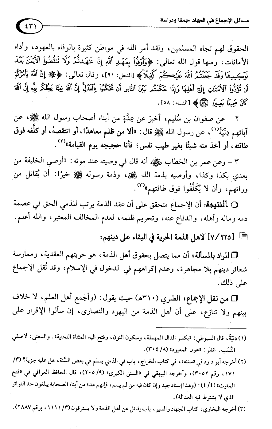(¬3) أخرجه البخاري، كتاب الجهاد والسير، باب يقاتل عن أهل الذمة ولا يسترقون (3/ 1111، برقم 2887).