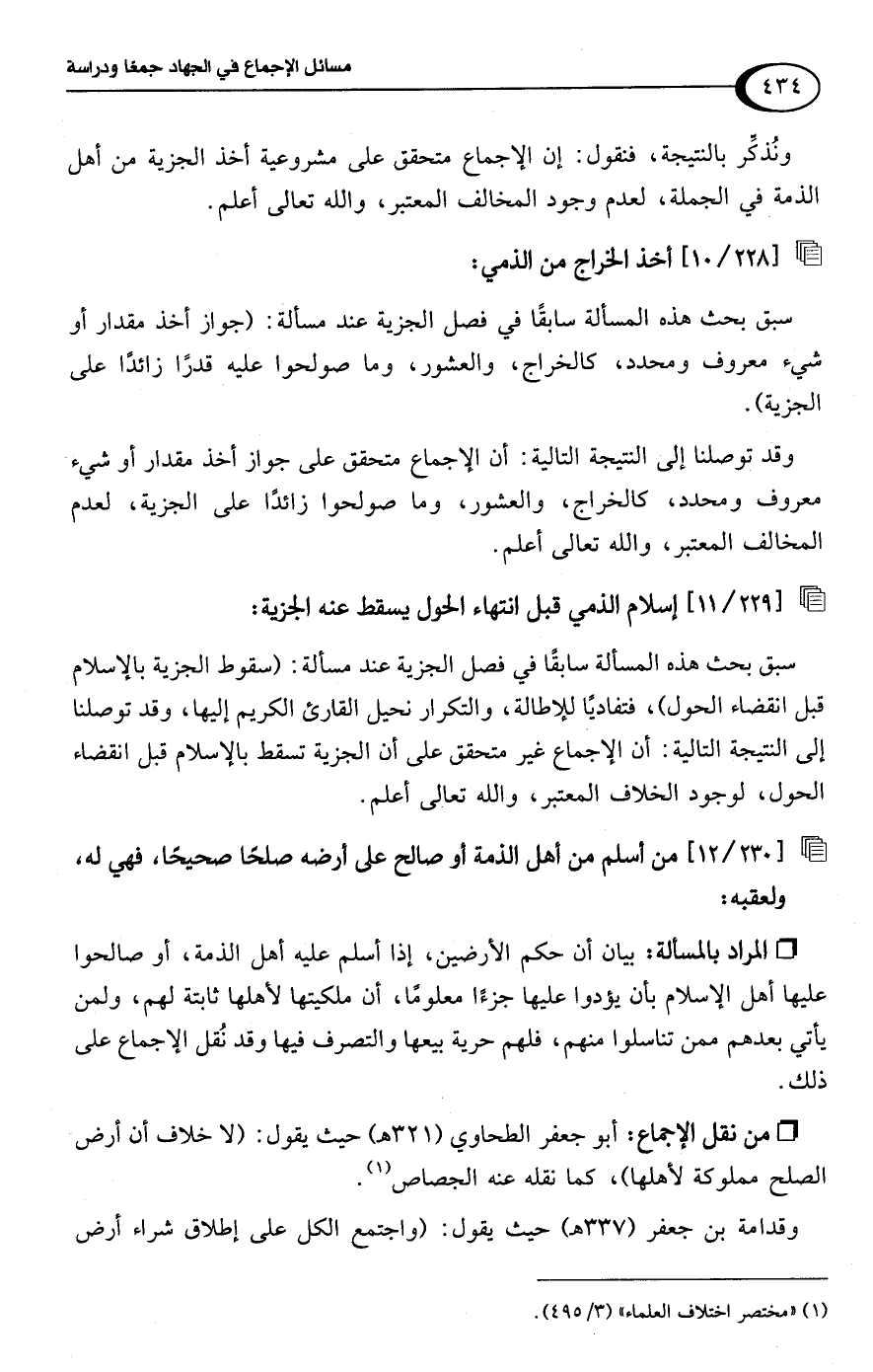سبق بحث هذه المسألة سابقًا في فصل الجزية عند مسألة: (سقوط الجزية بالإسلام قبل انقضاء الحول)، فتفاديًا للإطالة، والتكرار نحيل القارئ الكريم إليها، وقد توصلنا إلى النتيجة التالية: أن الإجماع غير متحقق على أن الجزية تسقط بالإسلام قبل انقضاء الحول، لوجود الخلاف المعتبر، واللَّه تعالى أعلم.