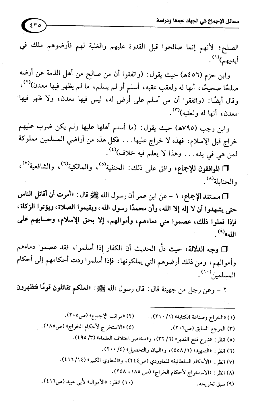 وابن حزم (456 هـ) حيث يقول: (واتفقوا أن من صالح من أهل الذمة عن أرضه صلحًا صحيحًا، أنها له ولعقب عقبه، أسلم أو لم يسلم، ما لم يظهر فيها معدن) (¬2)، وقال أيضًا: (واتفقوا أن من أسلم على أرض له، ليس فيها معدن، ولا ظهر فيها معدن، أنها له ولعقبه) (¬3).