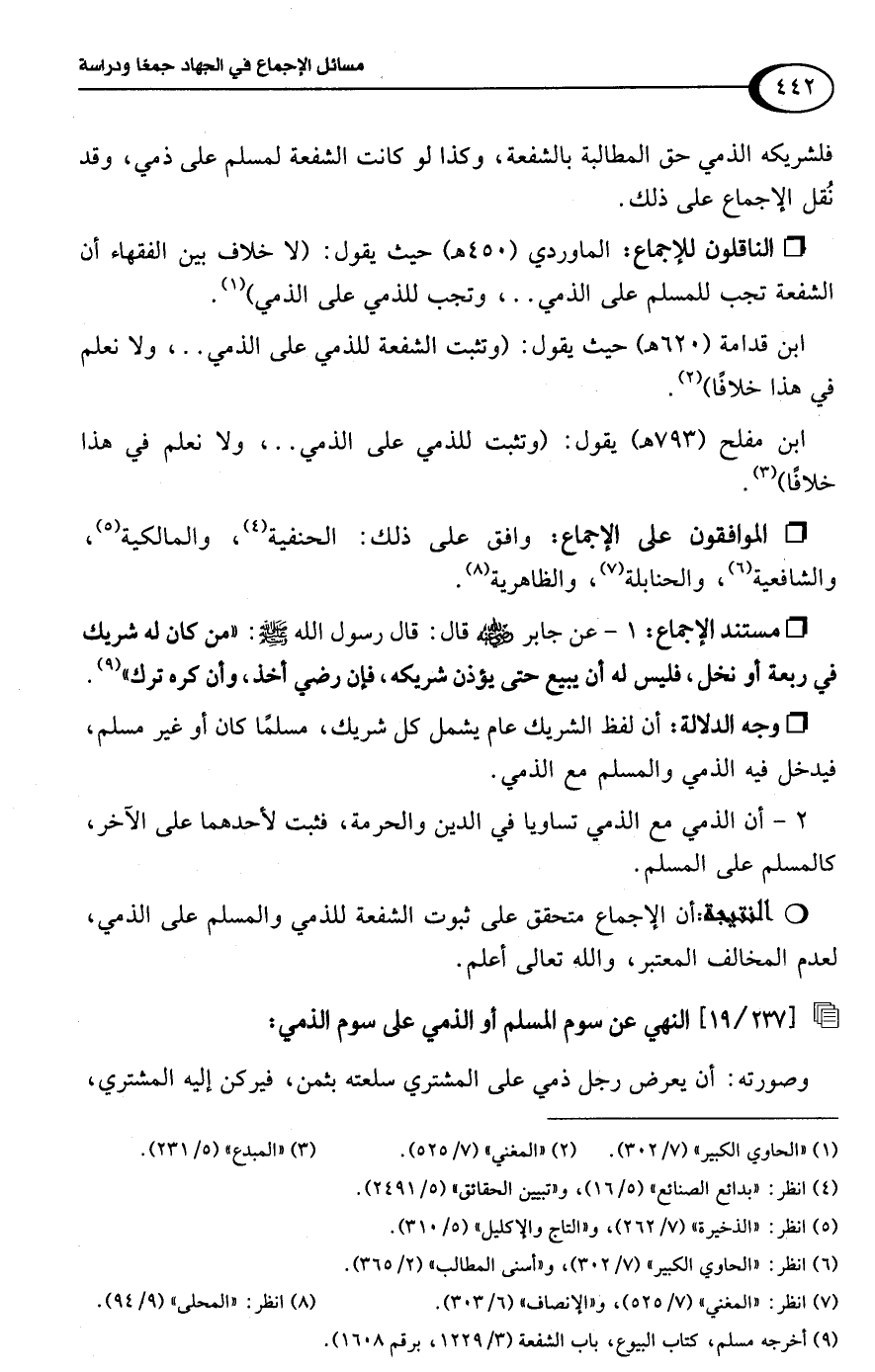 • الناقلون للإجماع: الماوردي (450 هـ) حيث يقول: (لا خلاف بين الفقهاء أن الشفعة تجب للمسلم على الذمي. .، وتجب للذمي على الذمي) (¬1).