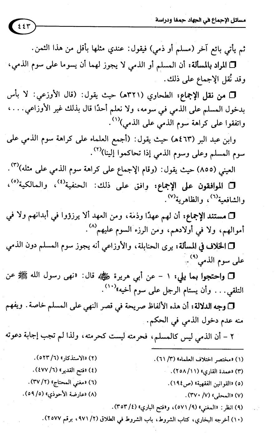 وابن عبد البر (463 هـ) حيث يقول: (أجمع العلماء على كراهة سوم الذمي على سوم المسلم وعلى وسوم الذمي إذا تحاكموا إلينا) (¬2).