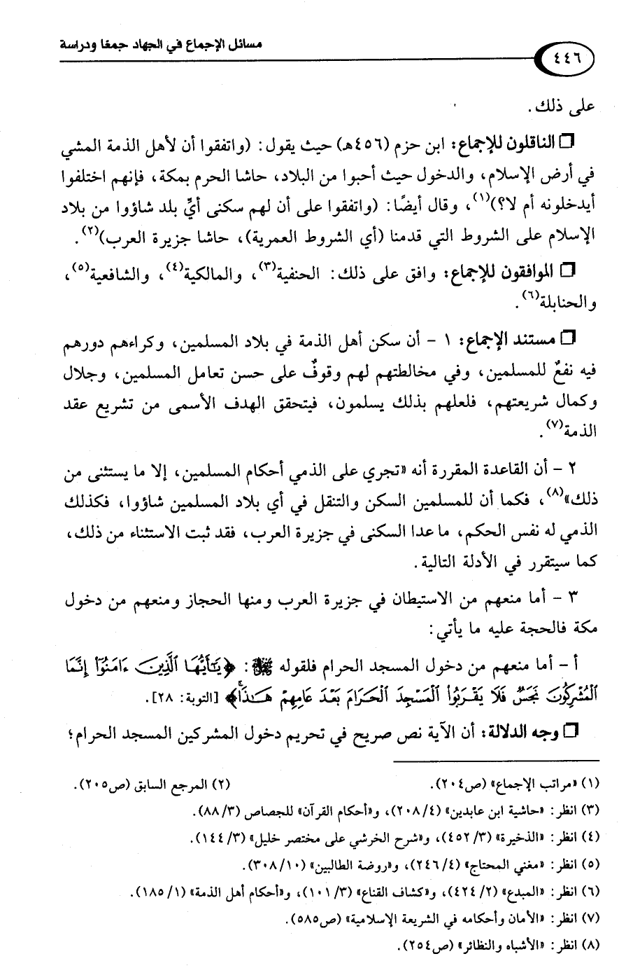 • الناقلون للإجماع: ابن حزم (456 هـ) حيث يقول: (واتفقوا أن لأهل الذمة المشي في أرض الإسلام، والدخول حيث أحبوا من البلاد، حاشا الحرم بمكة، فإنهم اختلفوا أيدخلونه أم لا؟ ) (¬1)، وقال أيضًا: (واتفقوا على أن لهم سكنى أيِّ بلد شاؤوا من بلاد الإسلام على الشروط التي قدمنا (أي الشروط العمرية)، حاشا جزيرة العرب) (¬2).