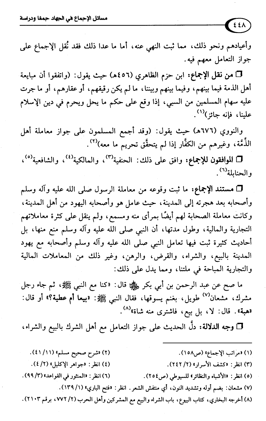 والنووي (676 هـ) حيث يقول: (وقد أجمع المسلمون على جواز معاملة أهل الذِّمَّة، وغيرهم من الكفَّار إذا لم يتحقق تحريم ما معه) (¬2).