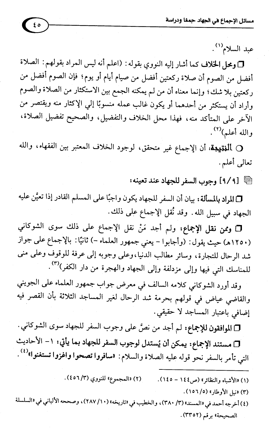 • الموافقون للإجماع: لم أجد من نصَّ على وجوب السفر للجهاد سوى الشوكاني.