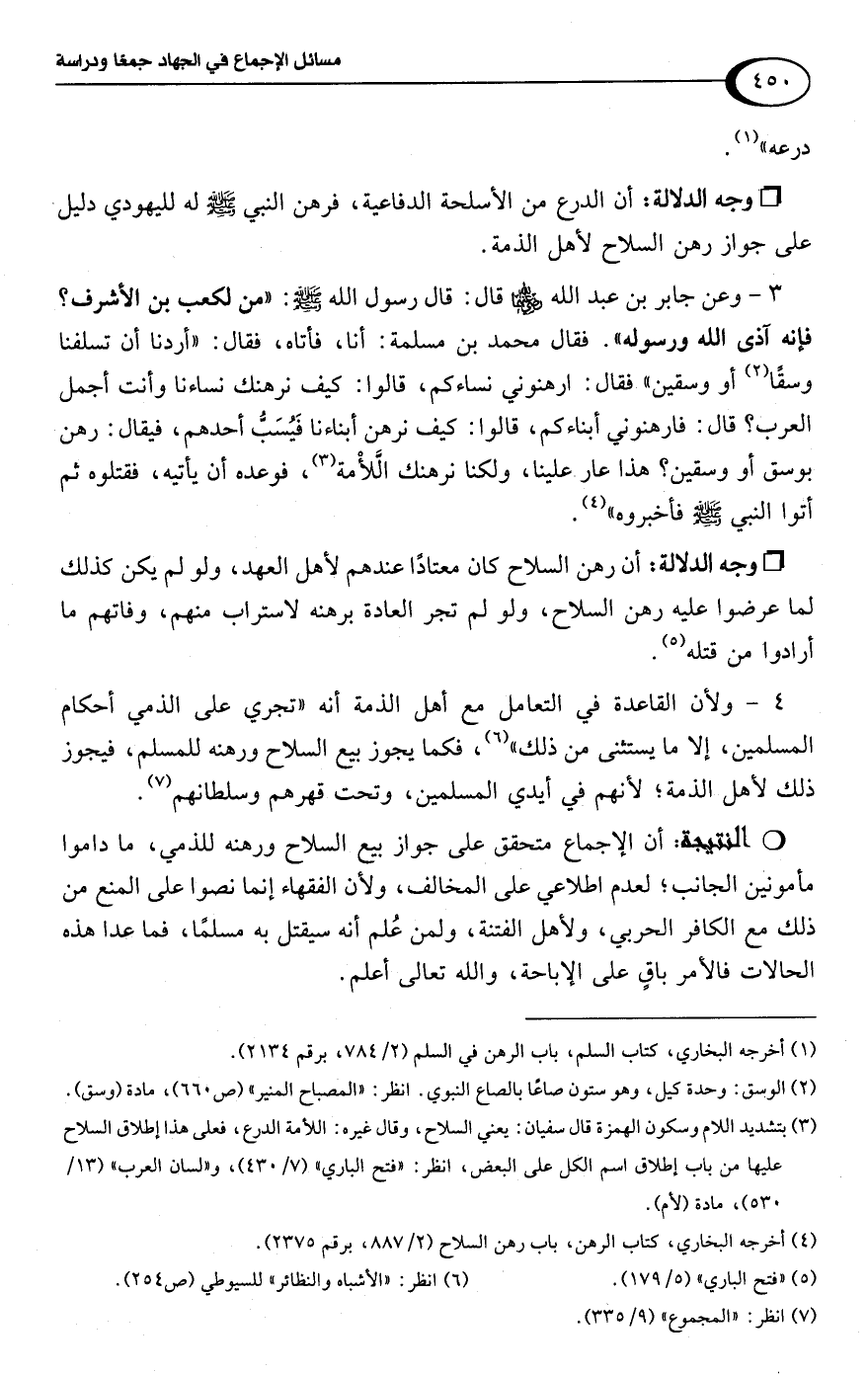 4 - ولأن القاعدة في التعامل مع أهل الذمة أنه "تجري على الذمي أحكام المسلمين، إلا ما يستثنى من ذلك" (¬6)، فكما يجوز بيع السلاح ورهنه للمسلم، فيجوز ذلك لأهل الذمة؛ لأنهم في أيدي المسلمين، وتحت قهرهم وسلطانهم (¬7).Rأن الإجماع متحقق على جواز بيع السلاح ورهنه للذمي، ما داموا مأمونين الجانب؛ لعدم اطلاعي على المخالف، ولأن الفقهاء إنما نصوا على المنع من ذلك مع الكافر الحربي، ولأهل الفتنة، ولمن عُلم أنه سيقتل به مسلمًا، فما عدا هذه الحالات فالأمر باقٍ على الإباحة، واللَّه تعالى أعلم.
