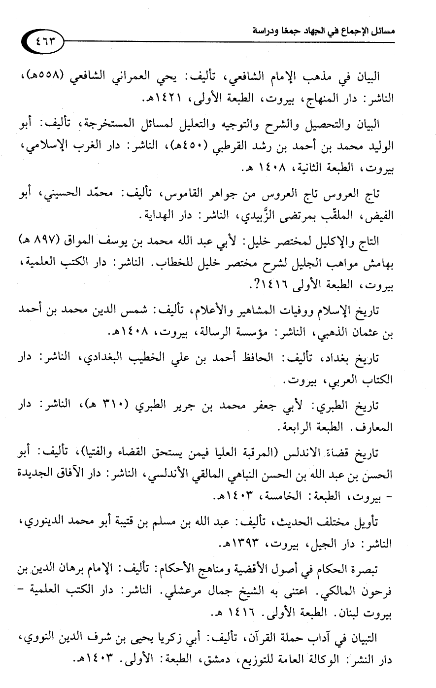 التاج والإكليل لمختصر خليل: لأبي عبد اللَّه محمد بن يوسف المواق (897 هـ) بهامش مواهب الجليل لشرح مختصر خليل للخطاب. الناشر: دار الكتب العلمية، بيروت، الطبعة الأولى 1416 هـ.